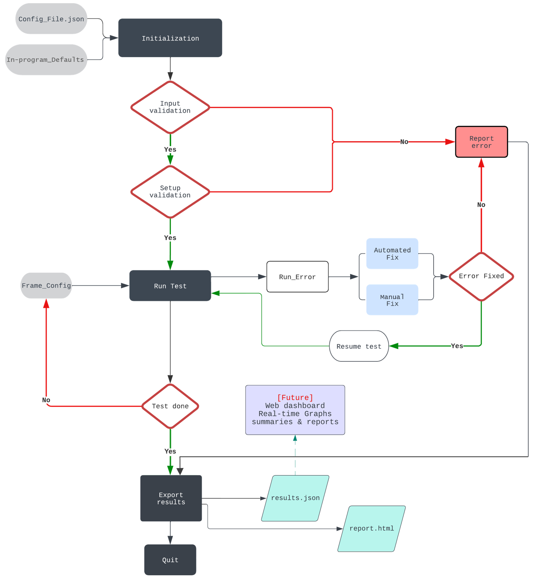 After validating and initializing the testing network, we proceed to the RFC 2544 throughput tests for each provided frame configuration. In case of errors that may occur during runtime, some automated workarounds are deployed to attempt to complete the tests (manual fixes are yet to be implemented).
